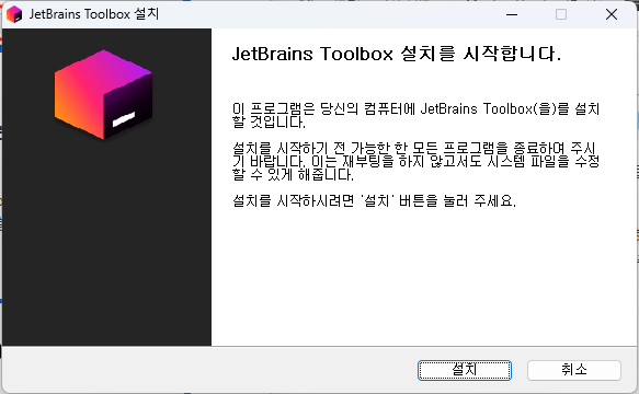 설치 프로그램이 종료되면서 자동으로 JetBrains Toolbox가 실행됩니다. 이후 JetBrains Toolbox는 컴퓨터 전원이 켜지면 자동으로 실행되며, 작업표시줄 우측에서 창을 열 수 있습니다.