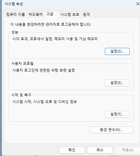 2. 고급 탭을 클릭 후 하단에 있는 환경 변수를 눌러줍니다.