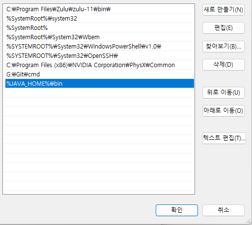 - 새로 만들기를 통해 %JAVA_HOME%\bin 을 입