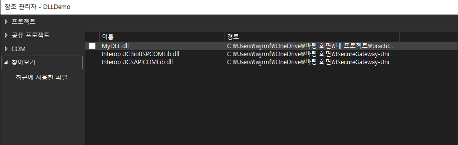 MyDLL.dill을 찾아보고 없을 경우 하단에 찾아보기(B)를 통해 build 되었던 파일을 찾아 추가하면 됩니다.