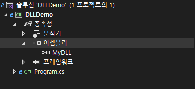 정상적으로 추가가 되면 다음과 같이 종속성 - 어셈블리에 MyDLL(라이브러리)가 추가됩니다.