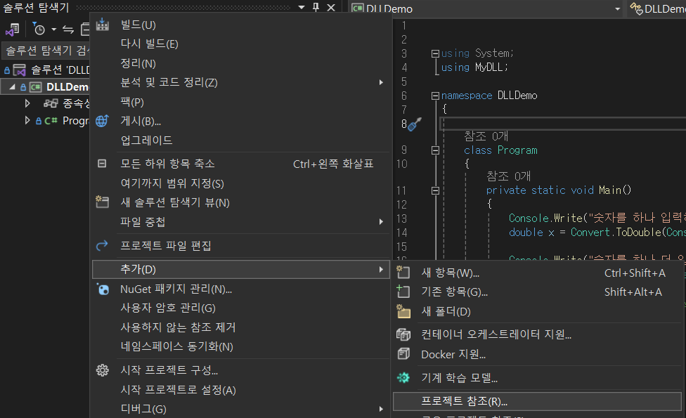 프로젝트(여기서는 DLLDemo) 마우스 우클릭에서 추가 -> 프로젝트 참조 클릭