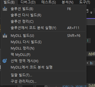 상단 메뉴에서 빌드 -> 솔루션 빌드를 선택하여 라이브러리 파일을 빌드해줍니다.