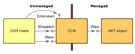 이러한 원활한 접근 방식을 만들기 위해 CCW는 IUnknown 및 IDispatch 와 같은 기존 COM 인터페이스를 제조한다. 다음 그림에서 볼 수 있듯이 CCW는 래핑하는 .NET 개체에 대한 단일 참조를 유지한다. COM 클라이언트와 .NET 개체는 모두 CCW의 프록시 및 스텁 구성을 통해 서로 상호 작용한다.