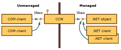 COM 클라이언트가 .NET 개체를 호출하면 공용 언어 런타임은 관리되는 개체와 해당 개체에 대한 CCW(COM 호출 가능 래퍼)를 만든다.