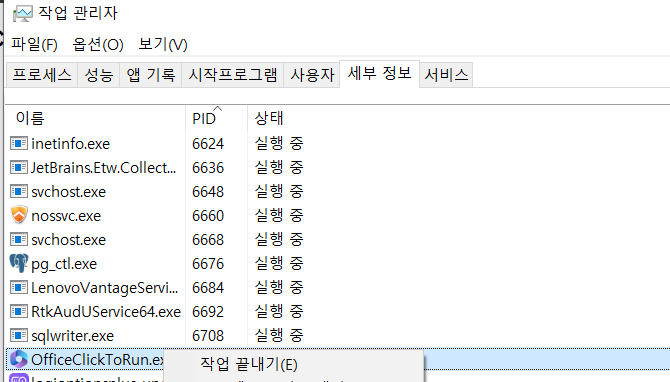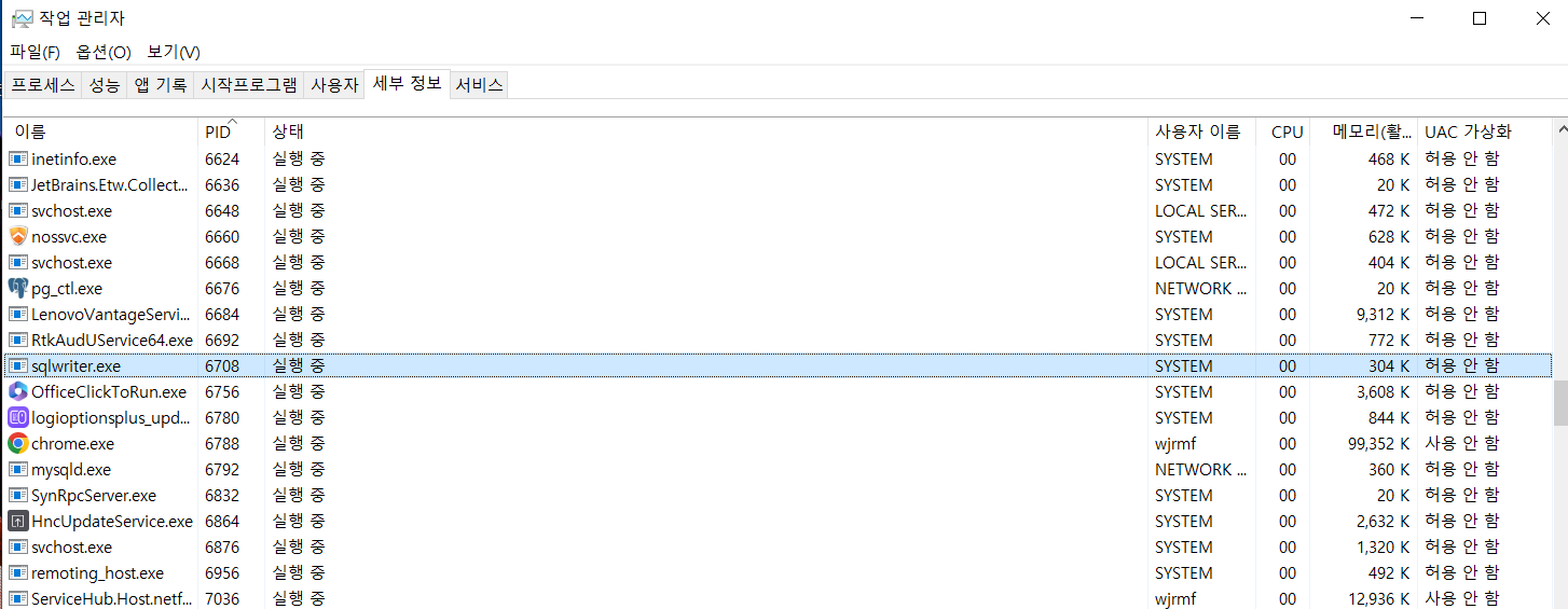 * 작업 관리자의 세부 정보로 들어가서 PID를 확인하면 됩니다. 저 같은 경우 1883을 사용하던 6744를 지워서 사진상으로는 안 보이는 상태입니다.