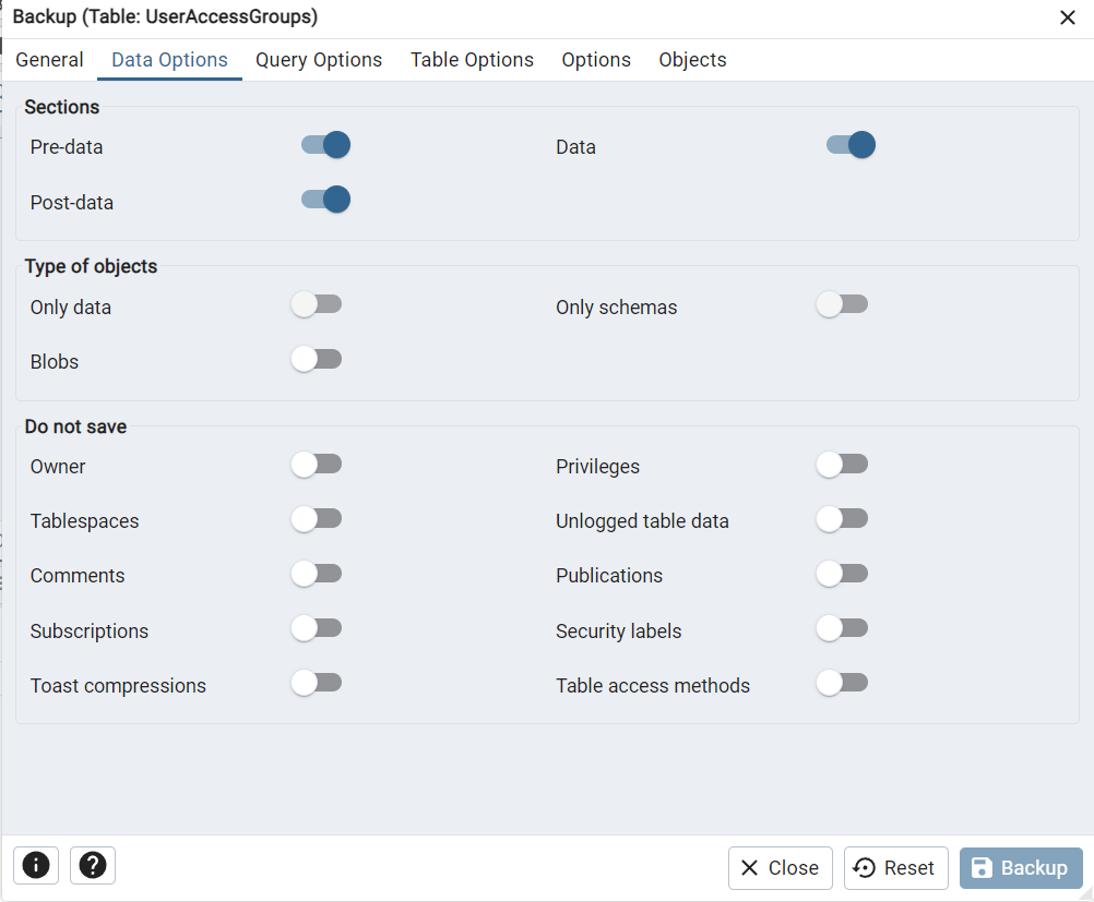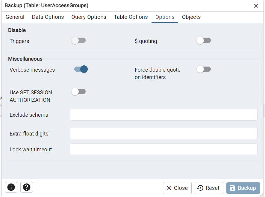 - Owner: 테이블 소유권을 포함하려면 이 옵션을 비활성화하여 소유자 정보를 백업에 포함합니다.