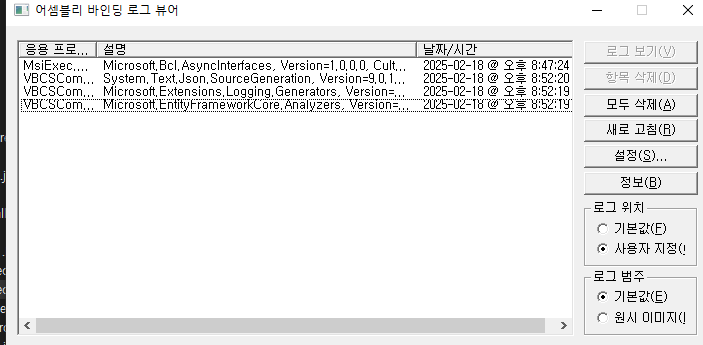 - 실패한 어셈블리 바인딩 기록이 있다면, 항목을 더블 클릭하여 상세 정보 확인