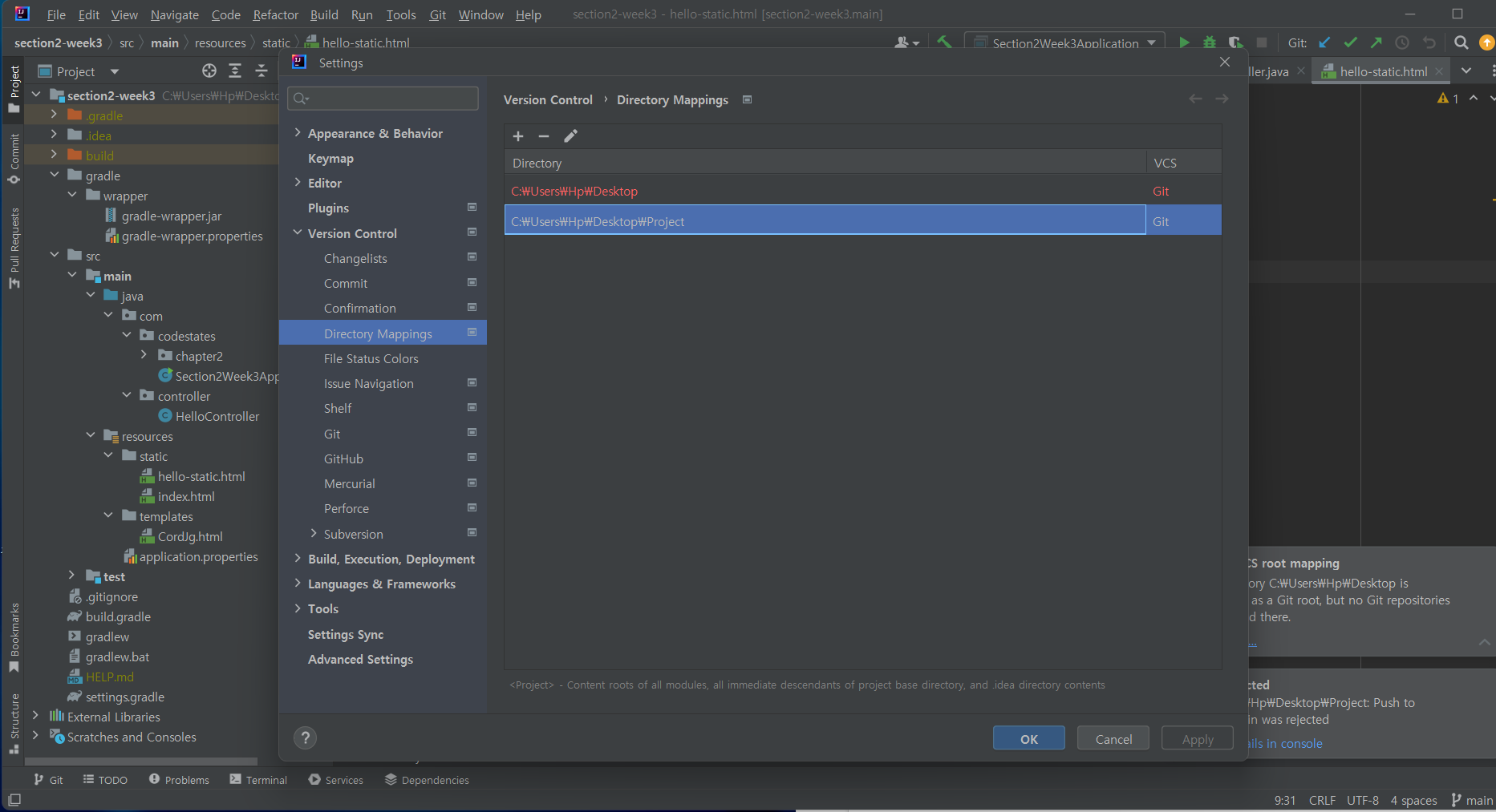 File -> Settings ->Version Control -> Directory Mappings 에서