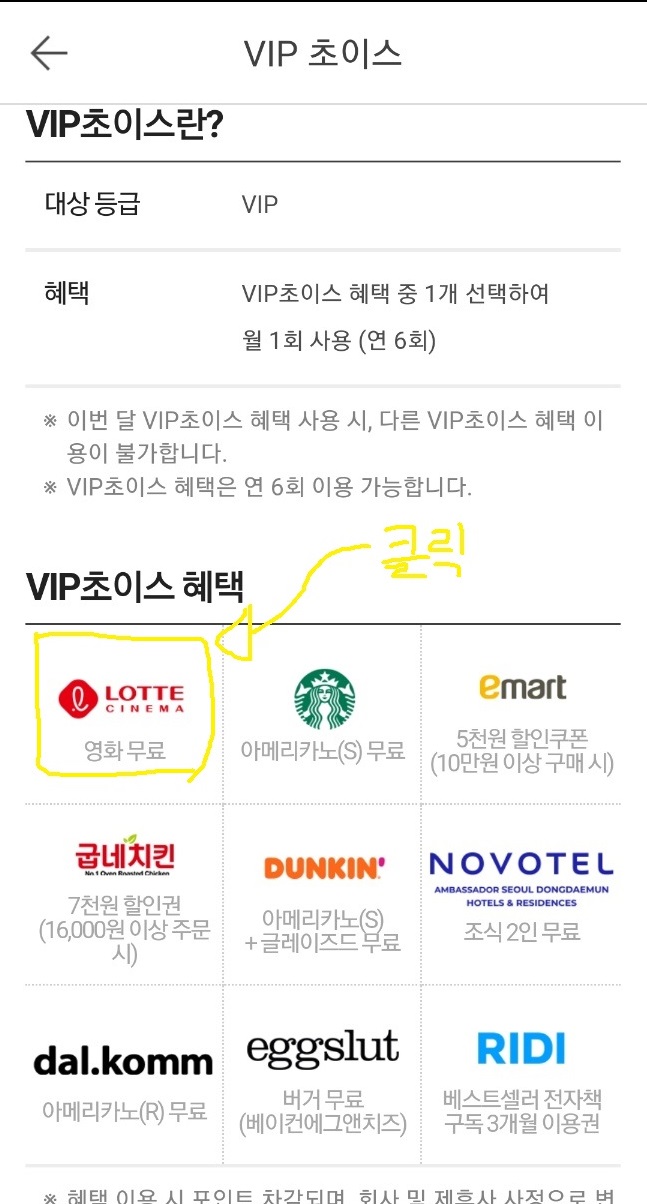 # 2월달에 롯데 시네마 영화표를 VIP초이스로 선택했으면 같은 달 굽네치킨할인이나, 던킨 할인등