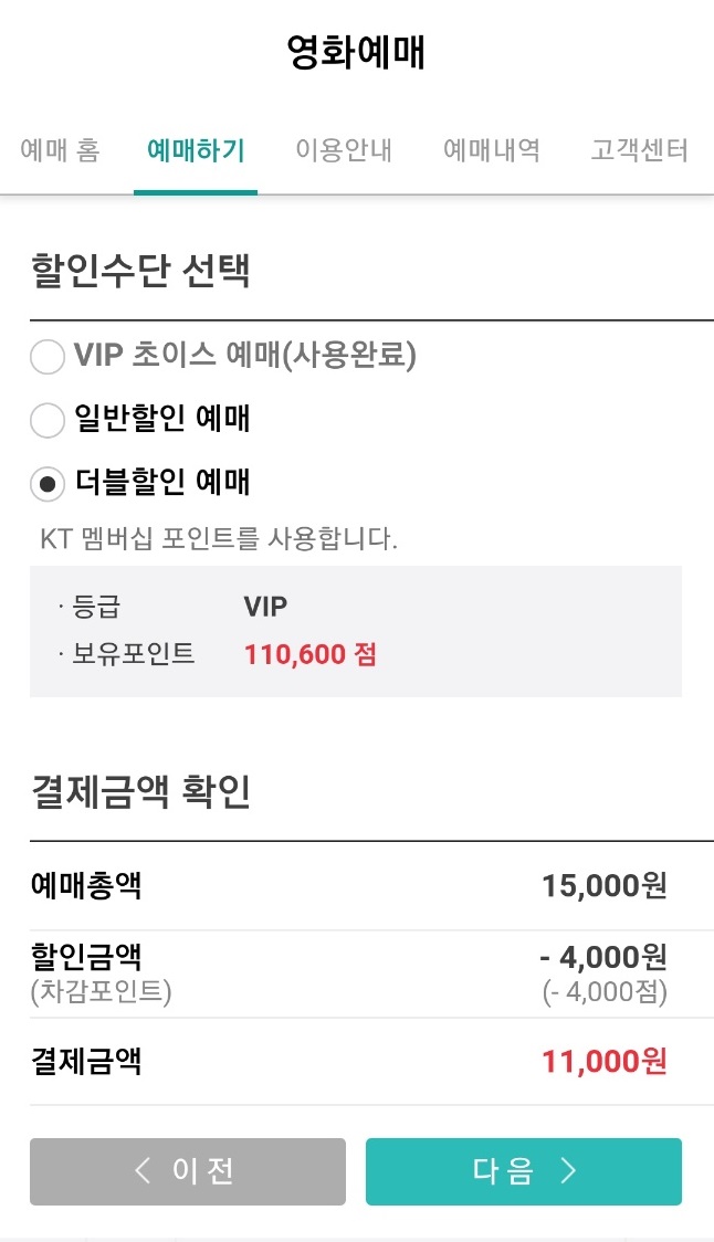 5. 영화 예매 6. 예매 후 결제 할 때 화면 (VIP 면 VIP 초이스 예매 (무료) , 그 외 일반할인 OR 더블할인가능)