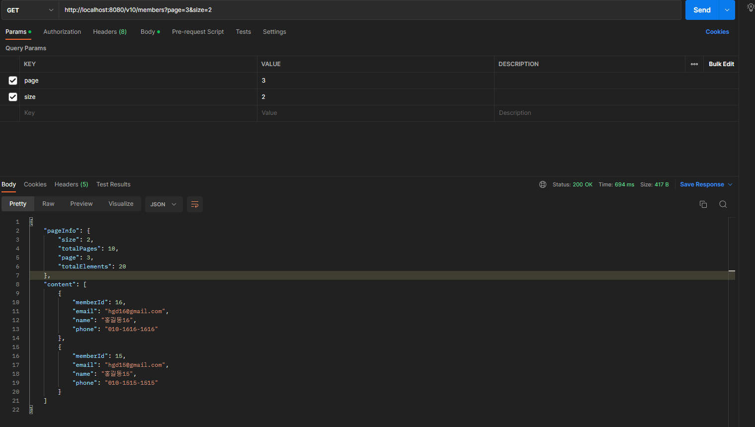 page와 size는 출력하고자 하는 페이지가 총 몇 페이지이며, 하나의 페이지에 몇 개의 요소를 출력할 것인지를 정하는 것입니다.